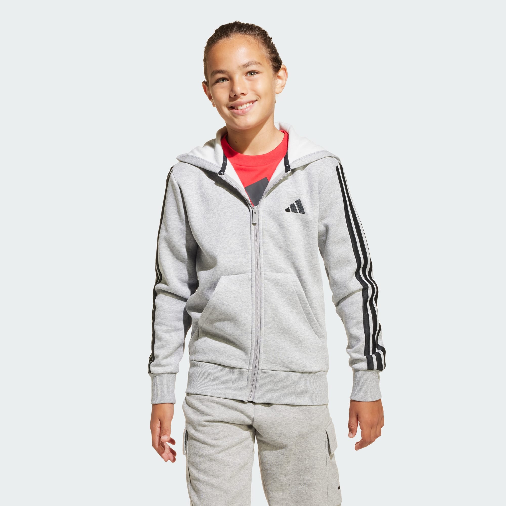 Questa felpa con cappuccio adidas junior è un capo essenziale da indossare nelle giornate più dinamiche. La struttura in tessuto felpato è pura morbidezza. Gli orli a coste migliorano il comfort, mentre la zip integrale sul davanti ti permette di regolare la copertura in base alle tue esigenze. A scuola o in giro con la tua crew, questa felpa con cappuccio ti assicura look sportivo e praticità casual.