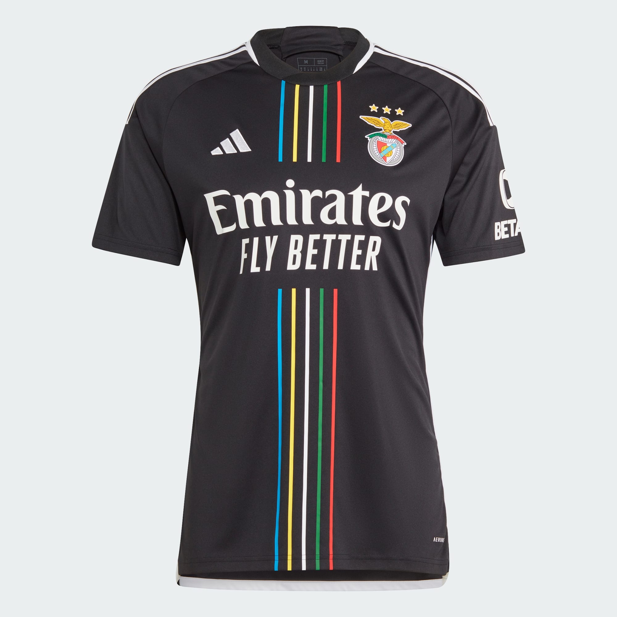 Il calcio unisce in linea retta Lisbona al resto del mondo. Le strisce blu, gialle, bianche, verdi e rosse su sfondo nero di questa maglia adidas del Benfica rappresentano in modo colorato questo club cosmopolita. Creata sia per giocare che per tifare, unisce la tecnologia antiumidità AEROREADY a inserti in mesh traspirante. La scritta "120 Anos" sul retro del collo celebra un traguardo storico.