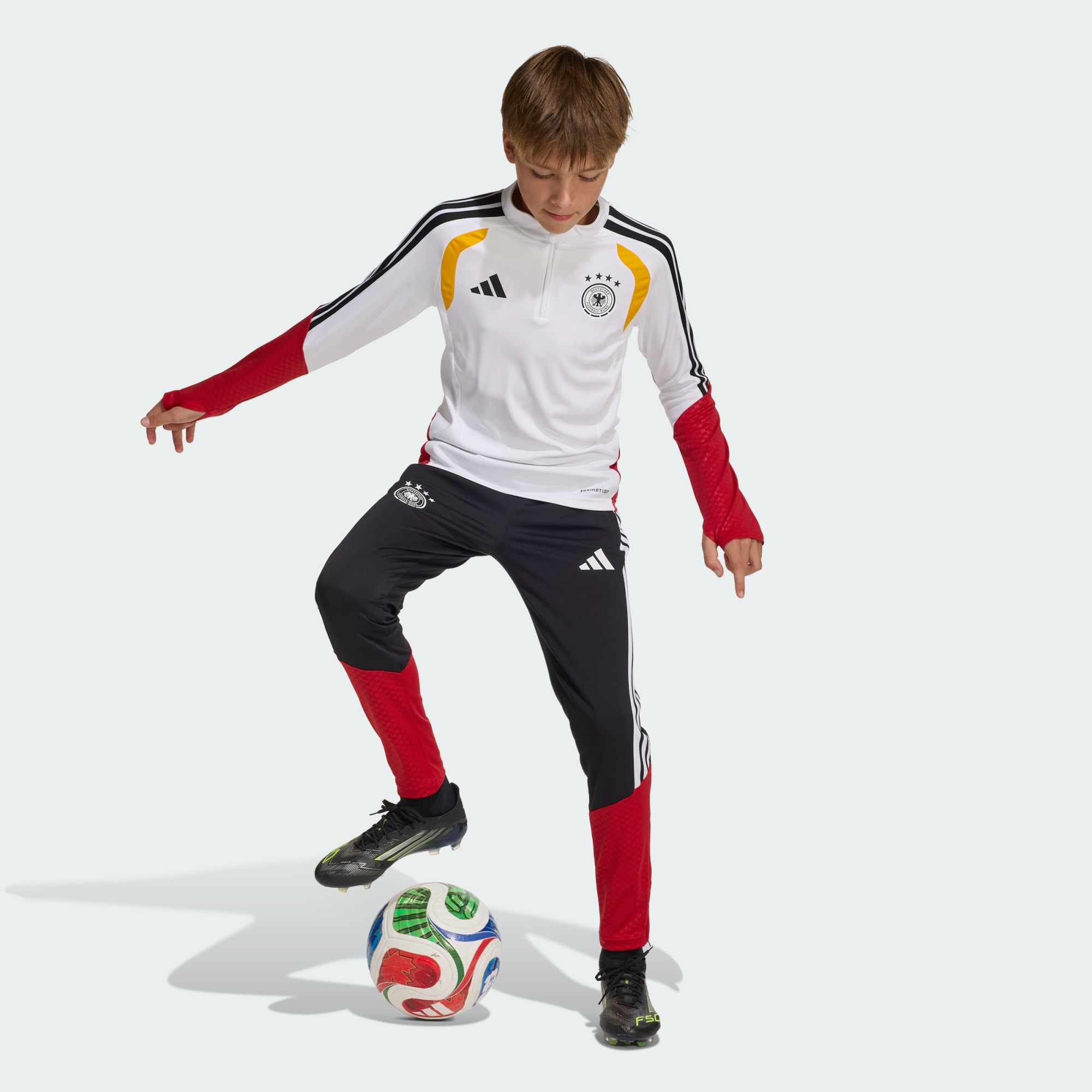 I pantaloni da allenamento Tiro 26 Germania sono progettati per aiutare i giovani amanti del calcio a sentirsi pronti per l'azione. Realizzati con tessuti elasticizzati meccanicamente, offrono prestazioni e comfort. adidas Formotion è progettato per liberare i movimenti dei più piccoli, non per limitarli: questi pantaloni della tuta a vestibilità aderente si muovono con loro, in modo che possano concentrarsi sul gioco. Inoltre, la chiusura con cordino consente una facile regolazione per una vestibilità sicura durante le sessioni di allenamento più intense. Sia in campo che fuori dal campo, questi pantaloni della tuta uniscono stile e funzionalità.