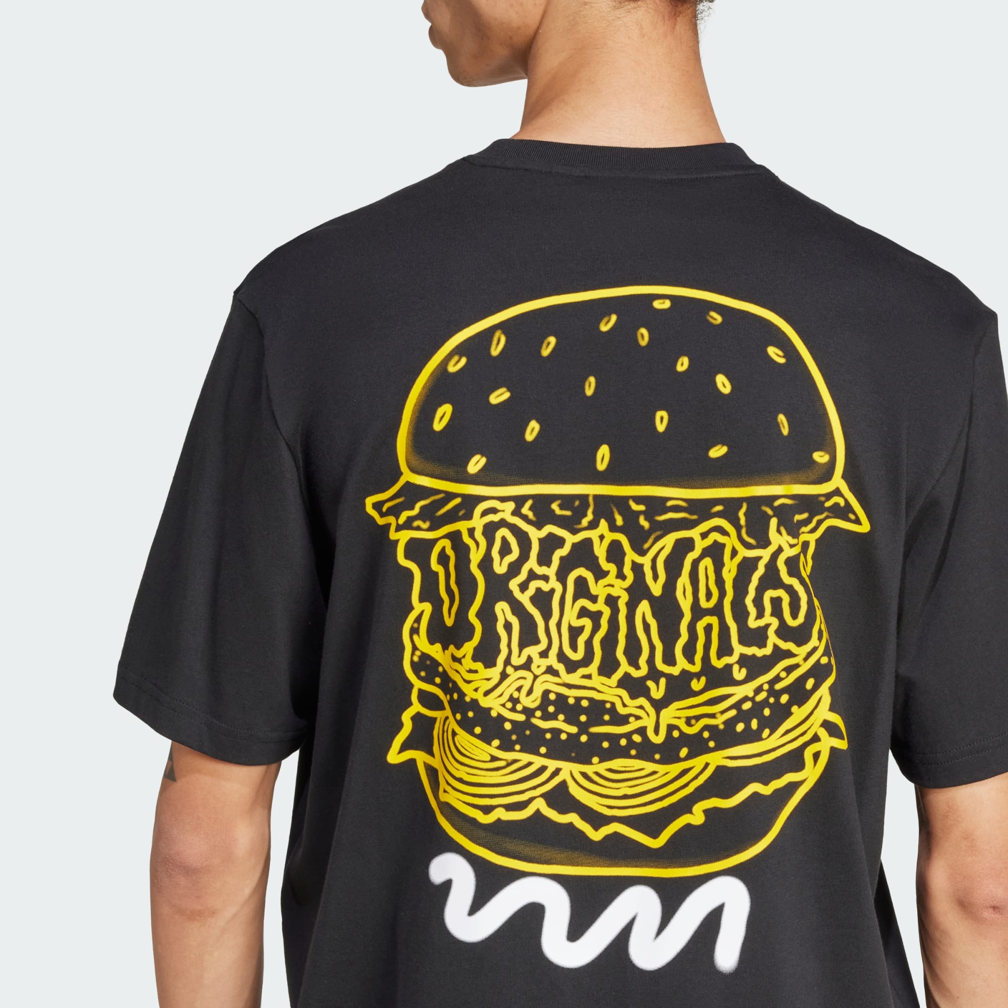 T-shirt adidas ampia con una grafica che mostra hamburger e patatine.